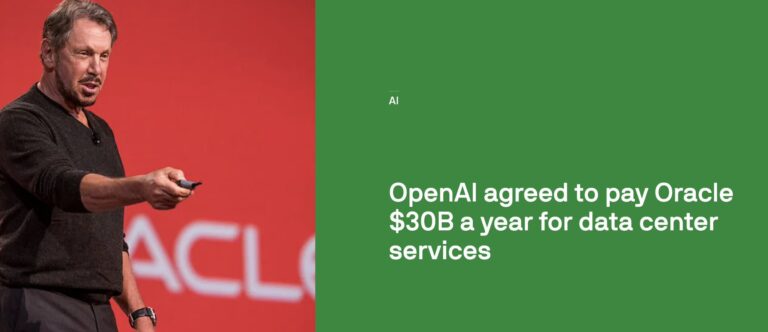 BlogBusiness OpenAI agreed to pay Oracle $30B a year for data center services michael.kochAugust 14, 2025August 19, 202501 mins OpenAI has confirmed its role in Oracle’s massive $30 billion-a-year cloud services deal, as first reported by The Wall Street…